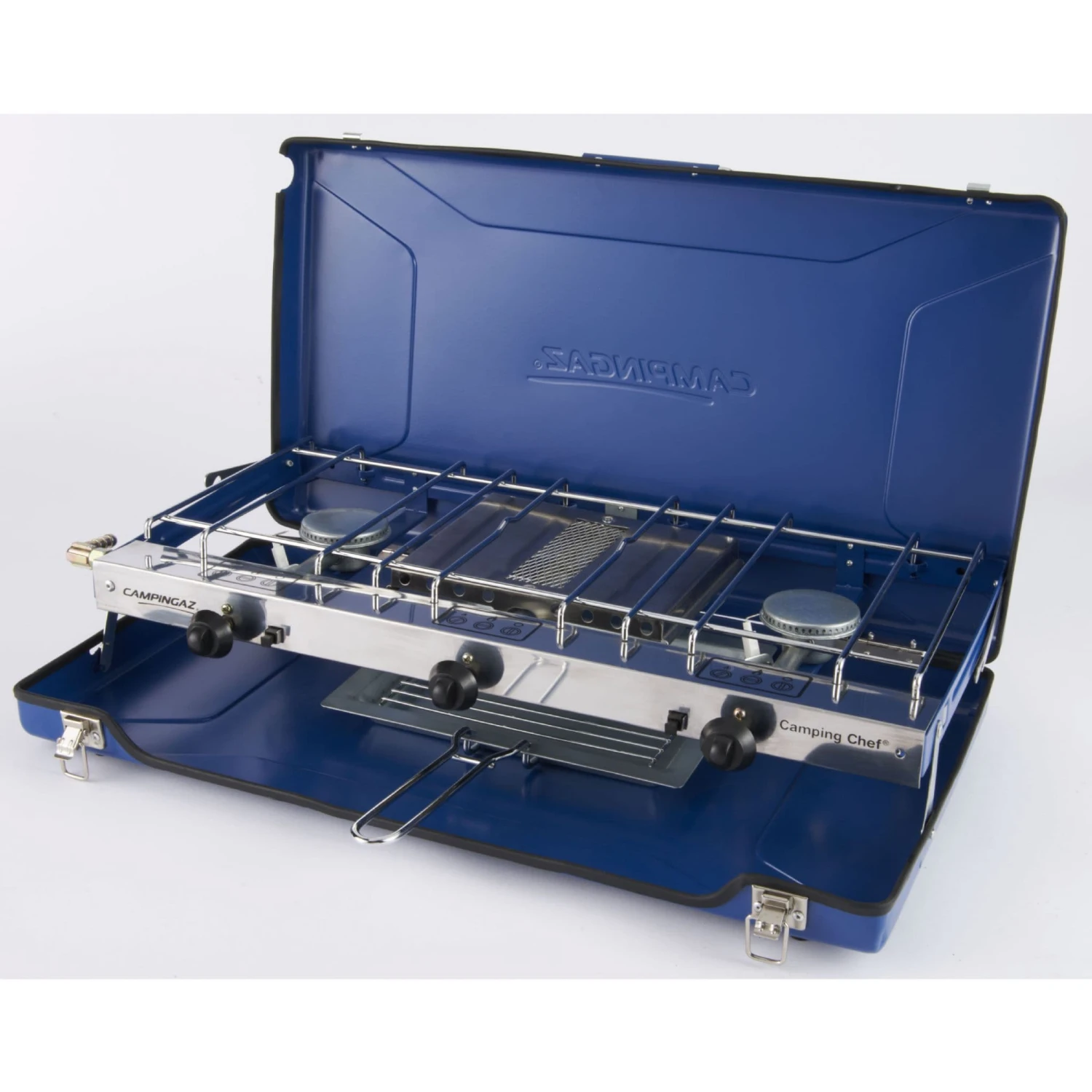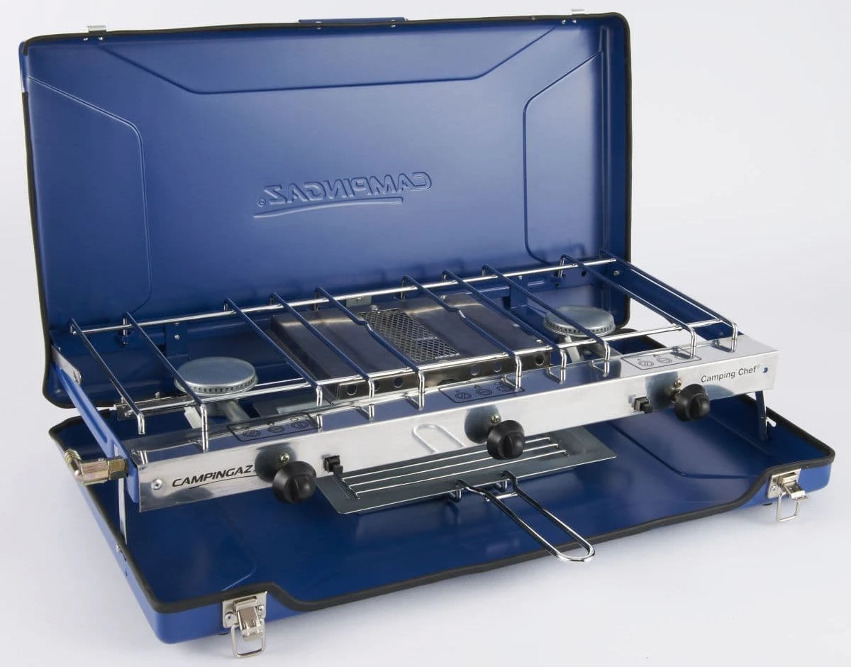 Family-size double burner stove with additional tube burner that is perfect for toasting and grilling. The durable stove packs down compactly for easy transport and storage.
