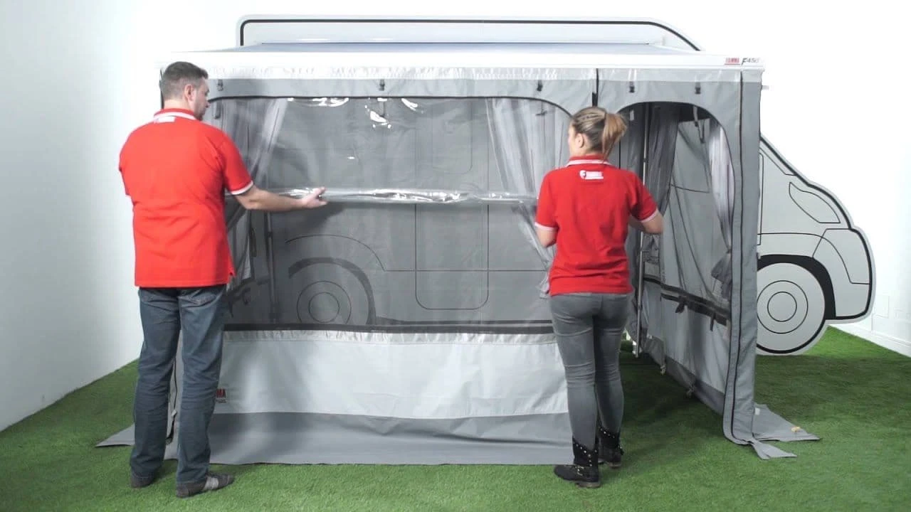 The panels are joined to the user’s awning fabric using the ‘Fast Clip’ internal lever hook system. The front and side panels are joint together by zips.