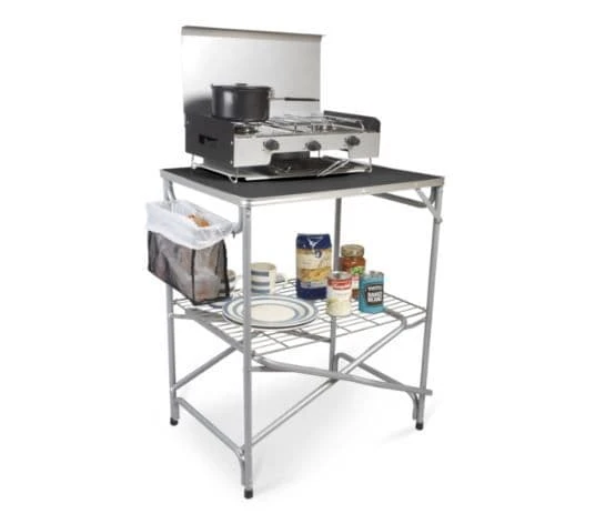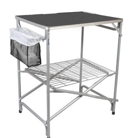 Ideal entry level camping kitchen. Simple to set-up with good table surface space and a storage rack underneath. A bin also attaches to the side which can be used for rubbish to keep the area clean.
