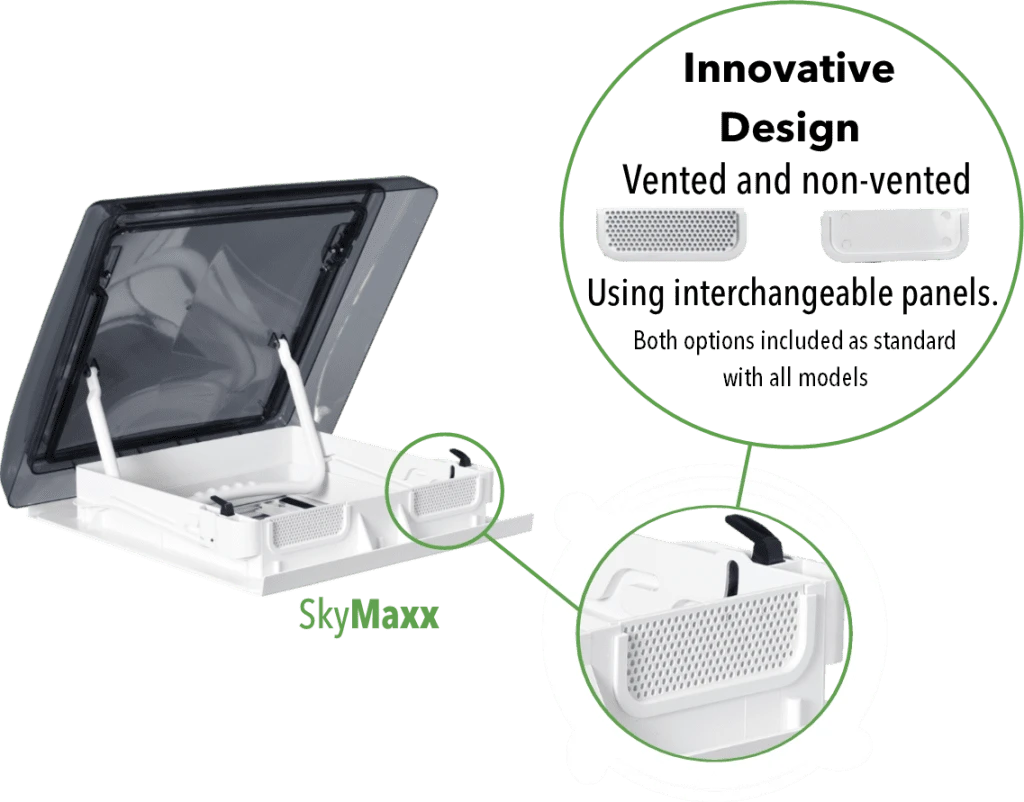 These Skymaxx Plus rooflights are a really cleverly designed product. These replace Dometic’s Mini Hekis 4 product codes for each the vented and non vented and 42 or 60mm max depths. Maxxair has come up with the ideal solution. One size fits from 23-60mm! Also by having interchangeable panels they can be both vented and non vented which suits either vehicles or caravans.