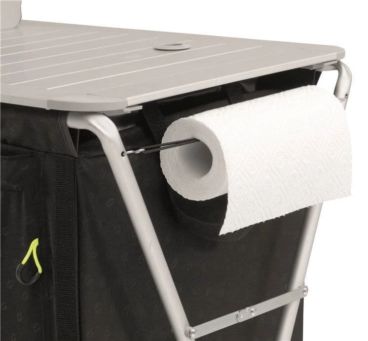 Richmond Kitchen Table is a smart kitchen table with a sturdy aluminium frame and black embossed fabric. The table top is also aluminium. Richmond Kitchen Table includes a collapsible water basin that is easily accessible through the table top.