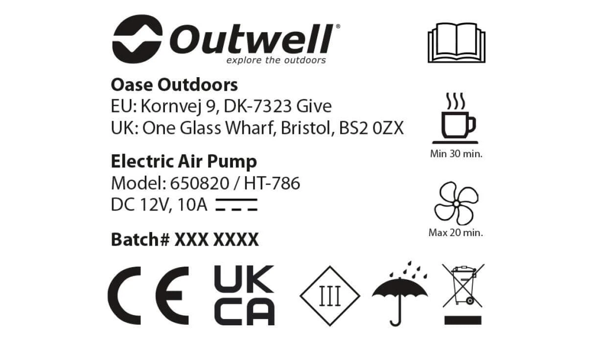 A quick and easy way to inflate your air tent, the Outwell Squall Tent Electric Pump automatically stops when it reaches the set pressure. This prevents over-inflation and ensures a rigid frame. Suitable for recharging on a 12V car power supply.