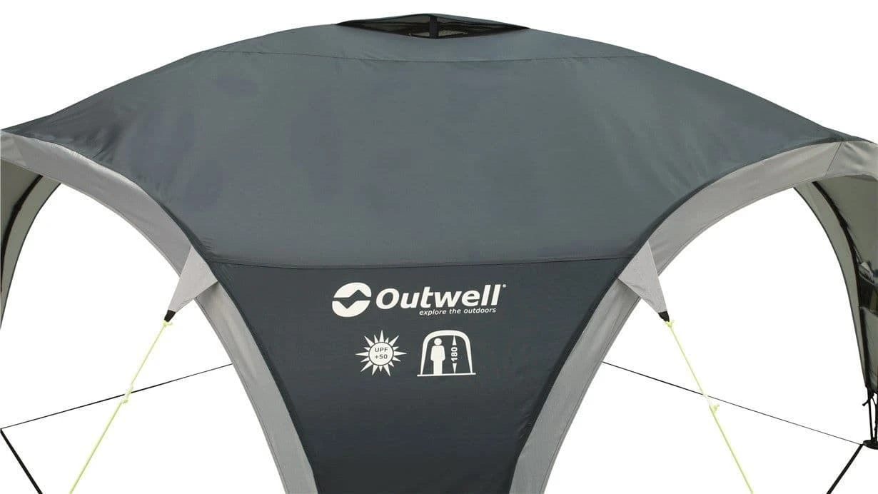 Offering versatile freestanding outdoor shelter with a wide range of uses, the Outwell Summer Lounge M is a sturdy, stable design with easy access and standing headroom. Apex ventilation and a central lantern hanging point plus two mesh pockets extend its practical flexibility. Its Outtex® 1500 Select Silver fabric has a UPF of 50+. To make a larger shelter, a gutter can connect compatible designs.