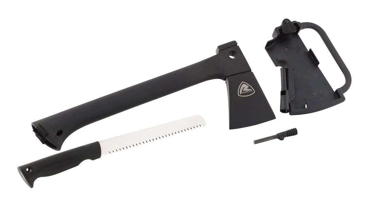 A strong a compact multi axe with 18 cm saw blade stored in the axe handle. The axe comes with a sheath with carry handle and adjustable and removable belt loop. In the axe sheath a fire steel is stored.
