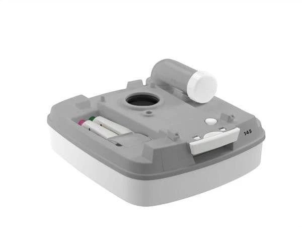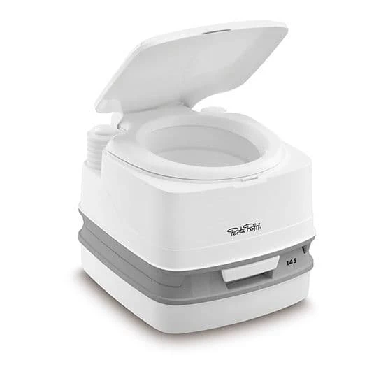 The Porta Potti 145 is a basic model with a natural seating height and a high capacity waste-holding tank