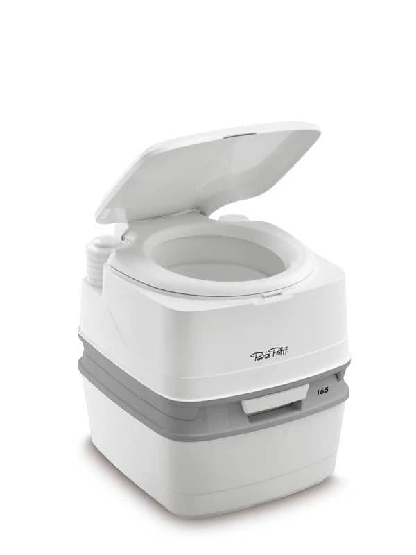 The Porta Potti 165 is a basic model with a natural seating height and a high capacity waste-holding tank