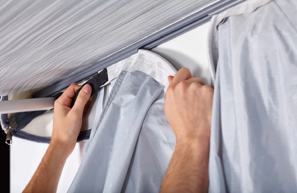 - Easily slide the profiles over the integrated sinew attached at the inner side of bag awning Thule Omnistor 1200